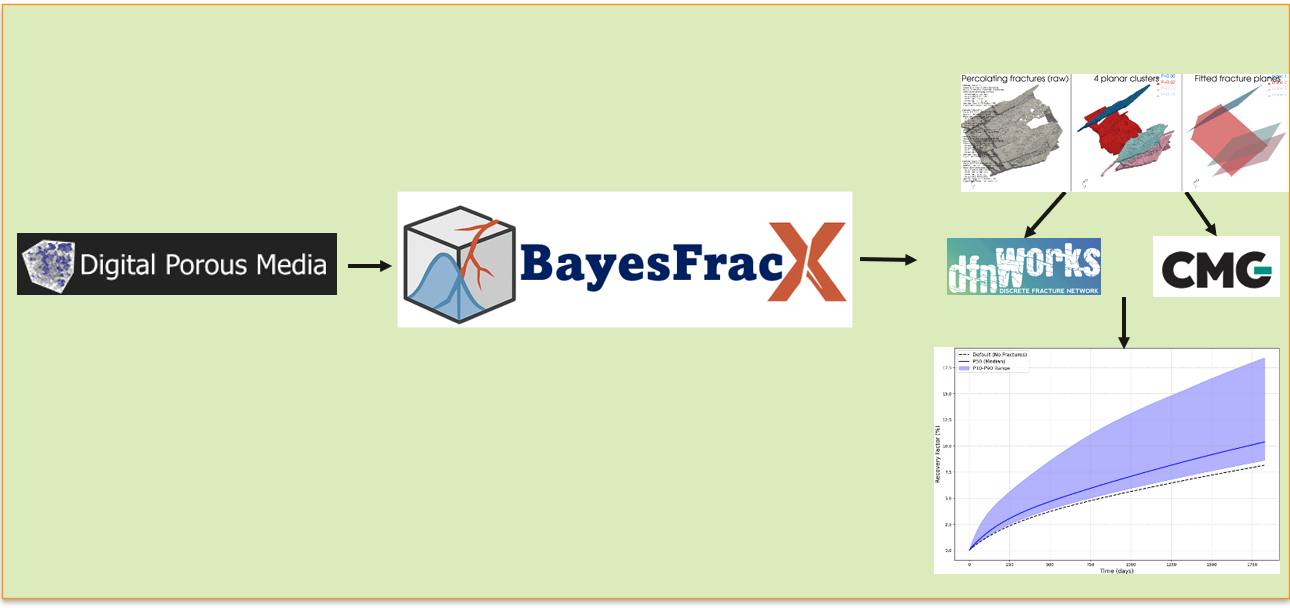 BayesFracX (repo coming soon): An open-source pipeline for the automatic identification and characterization of fractures in digital rock images. I developed a novel numerical method based on a Dirichlet-Process Bayesian Gaussian Mixture Model (DP-BGMM) that automatically detects and classifies fractures from μCT images. The processed fracture data can be exported directly to commercial discrete fracture network (DFN) simulators such as dfnWorks and CMG, enabling seamless upscaling to reservoir-scale performance models. Case studies have been deployed using open-source data from the Digital Rocks Portal (now Digital Porous Media). This work is planned for presentation at AGU25, alongside a journal publication and software release.