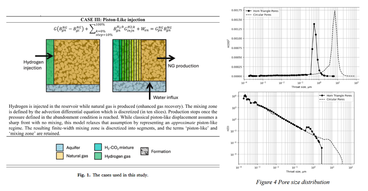 Analytical Framework for Hydrogen Storage & Geo-Methanation: Developed a mathematical model for underground hydrogen storage that covers (i) H₂ injection into depleted reservoirs, (ii) H₂ + CO₂ co-injection for geo-methanation, and (iii) H₂ injection for enhanced gas recovery (EGR). The framework integrates material balance, multiple equations of state (EoS), advection-driven gas mixing, water influx modeling, and Gibbs free-energy minimization. Published in Energy Conversion & Management (2025).